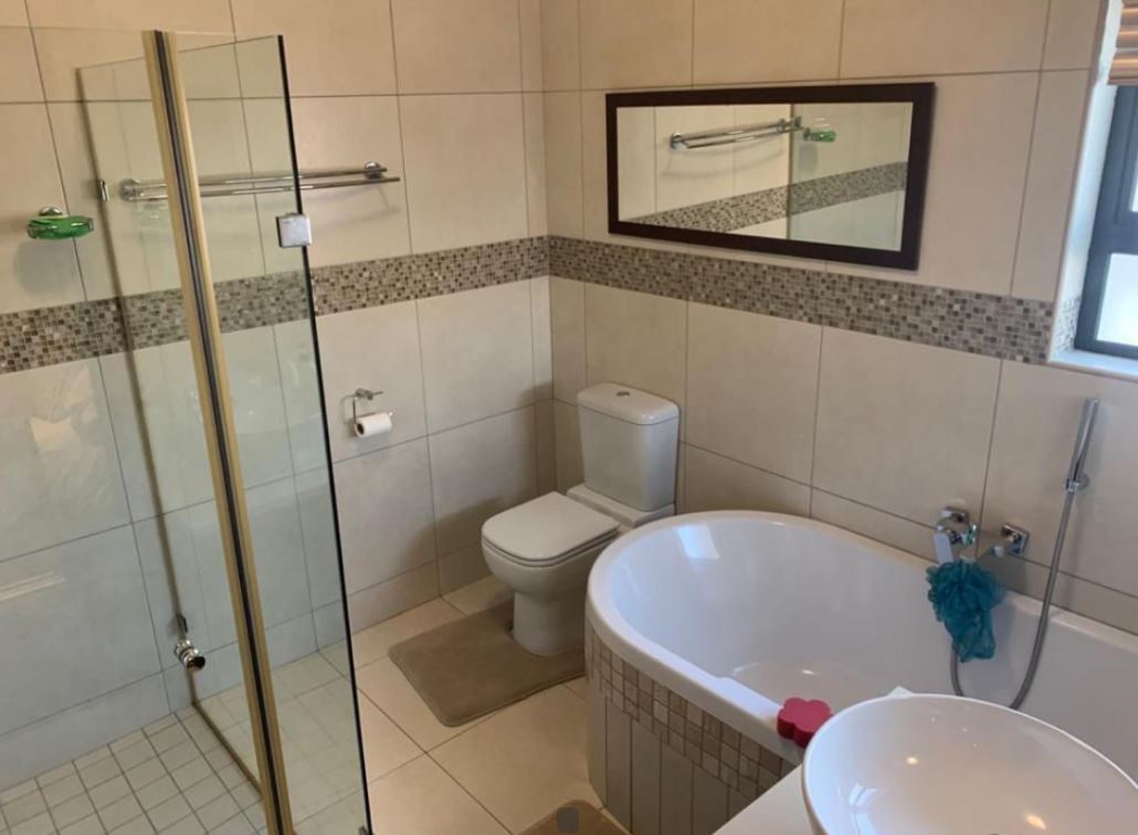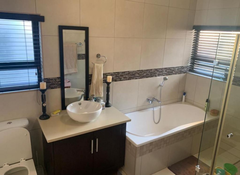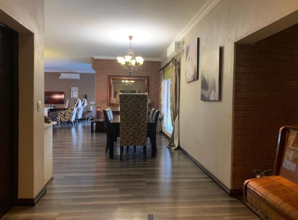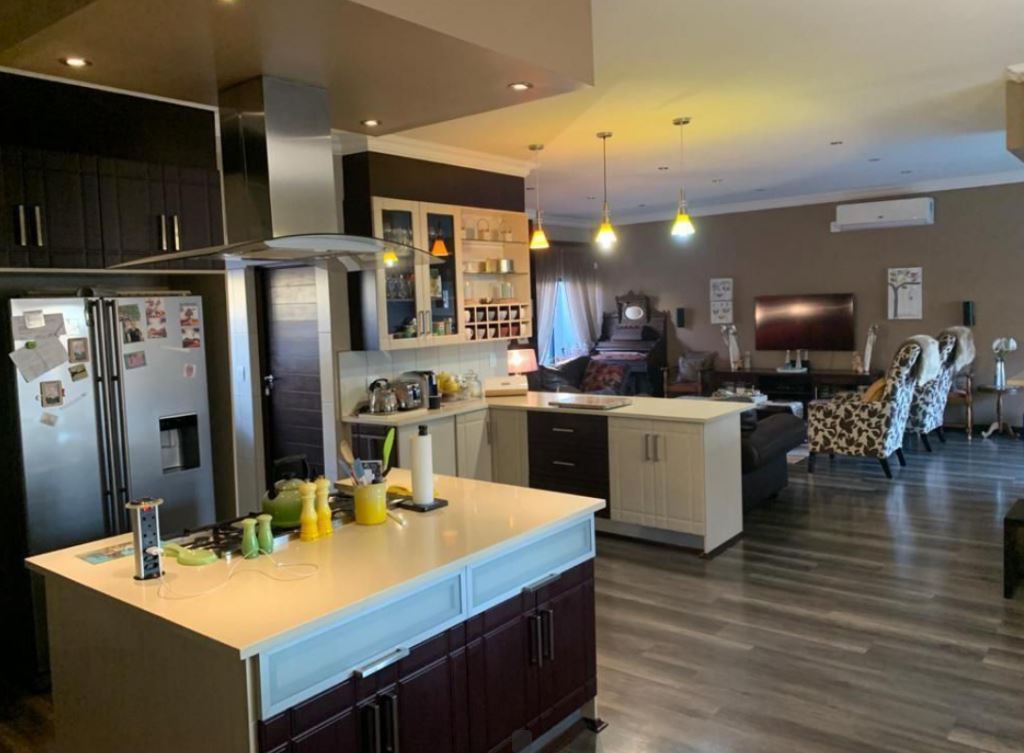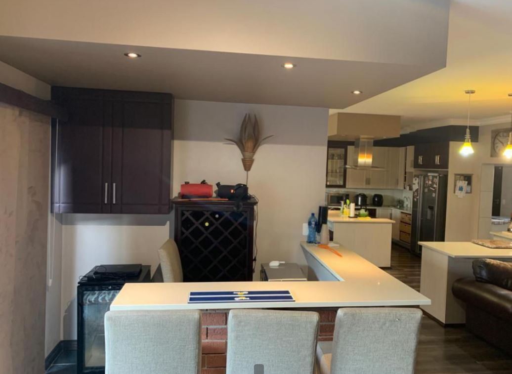 This modern, upmarket 4-bedroom house offers a luxurious and comfortable lifestyle, situated near all amenities and Mall off the North. The property offers the latest and most modern finishes one can only dream of to entertain guests. The well designed open-plan kitchen is complemented with a scullery that boasts space for all appliances and a beautiful centre Island overlooking the lounge and dining room with a bar and patio area with a built-in braai. High ceilings are visible throughout the house and every room has large windows allowing lots of light to enter and brighten up the rooms. Two bedrooms has their own en-suite bathrooms with ample cupboard space. Additional features: Wendy House and Solar heated pool.